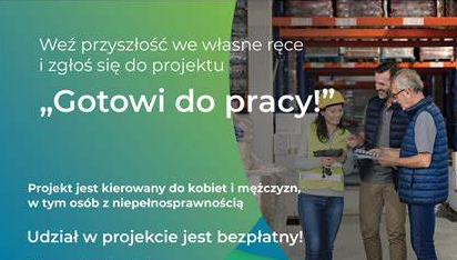 Z przyjemnością informujemy o rozpoczęciu realizacji projektu „Gotowi do pracy!”. Projekt jest kierowany do osób bezrobotnych i biernych zawodowo, wieku 30 lat i więcej z niskimi kwalifikacjami, z terenu województwa podkarpackiego.