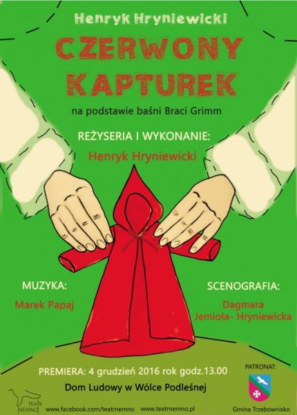 4 grudnia o godzinie 13.00 w Domu Ludowym w Wólce Podleśnej odbędzie się spektakl pn." Czerwony Kapturek". Serdecznie zapraszamy!