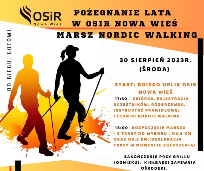Ośrodek Sportu i Rekreacji w Nowej Wsi zaprasza na marsz nordic walking w dniu 30 sierpnia 2023 r. Zapisy w kasie pływalni do 25 sierpnia 2023 r.