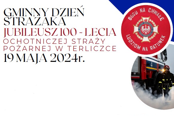 Serdecznie zapraszamy na „Gminny Dzień Strażaka”, połączony z Jubileuszem 100-lecia Ochotniczej Straży Pożarnej w Terliczce.